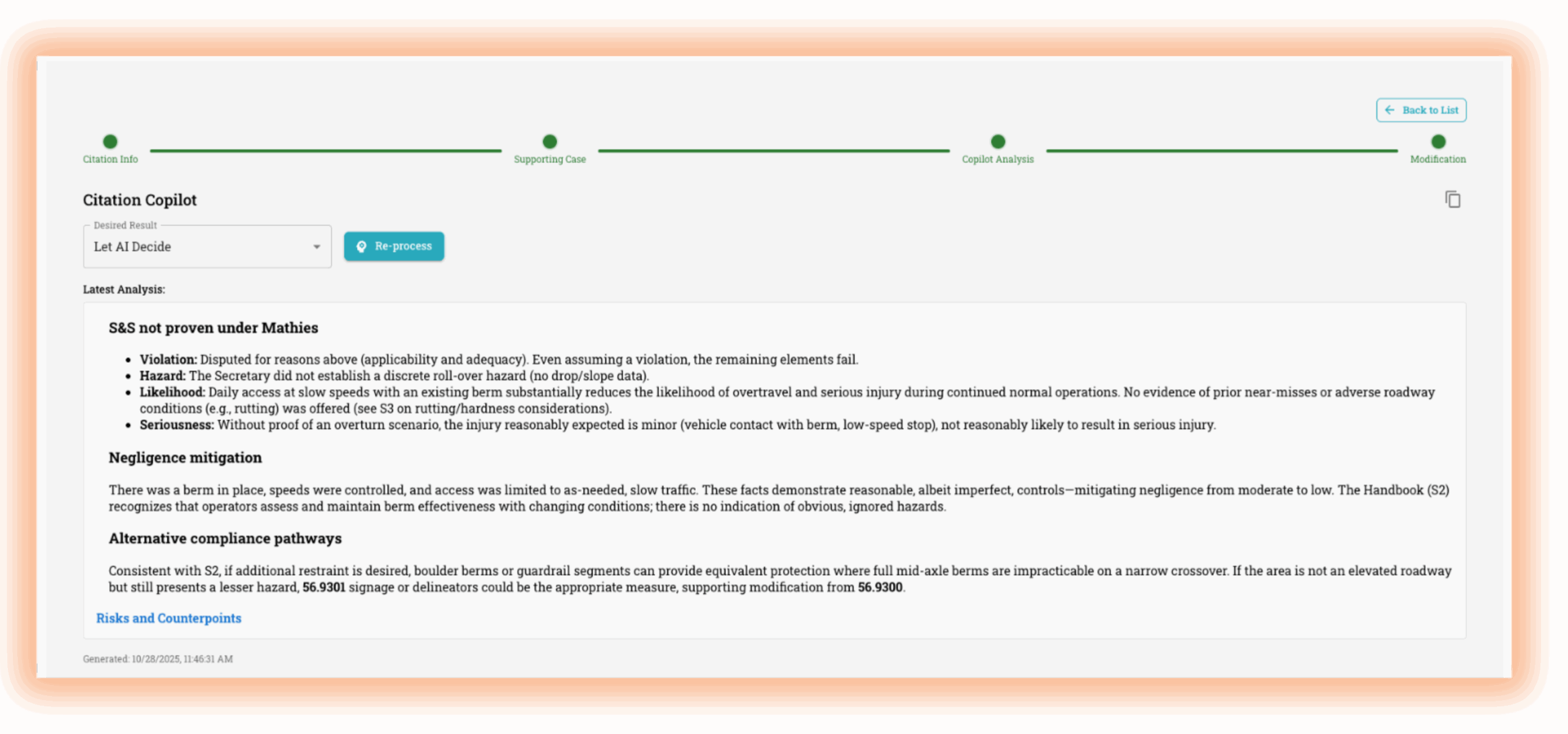 MSHAWISE structures citation analysis around regulations (30 CFR), PPM guidance, and FMSHRC case law. Every recommendation traces to authoritative sources. Consistent workflow from issuance → informal conference → contest prep. This isn’t replacing counsel—it’s empowering your team with structured analysis and source documentation to make defensible decisions faster.